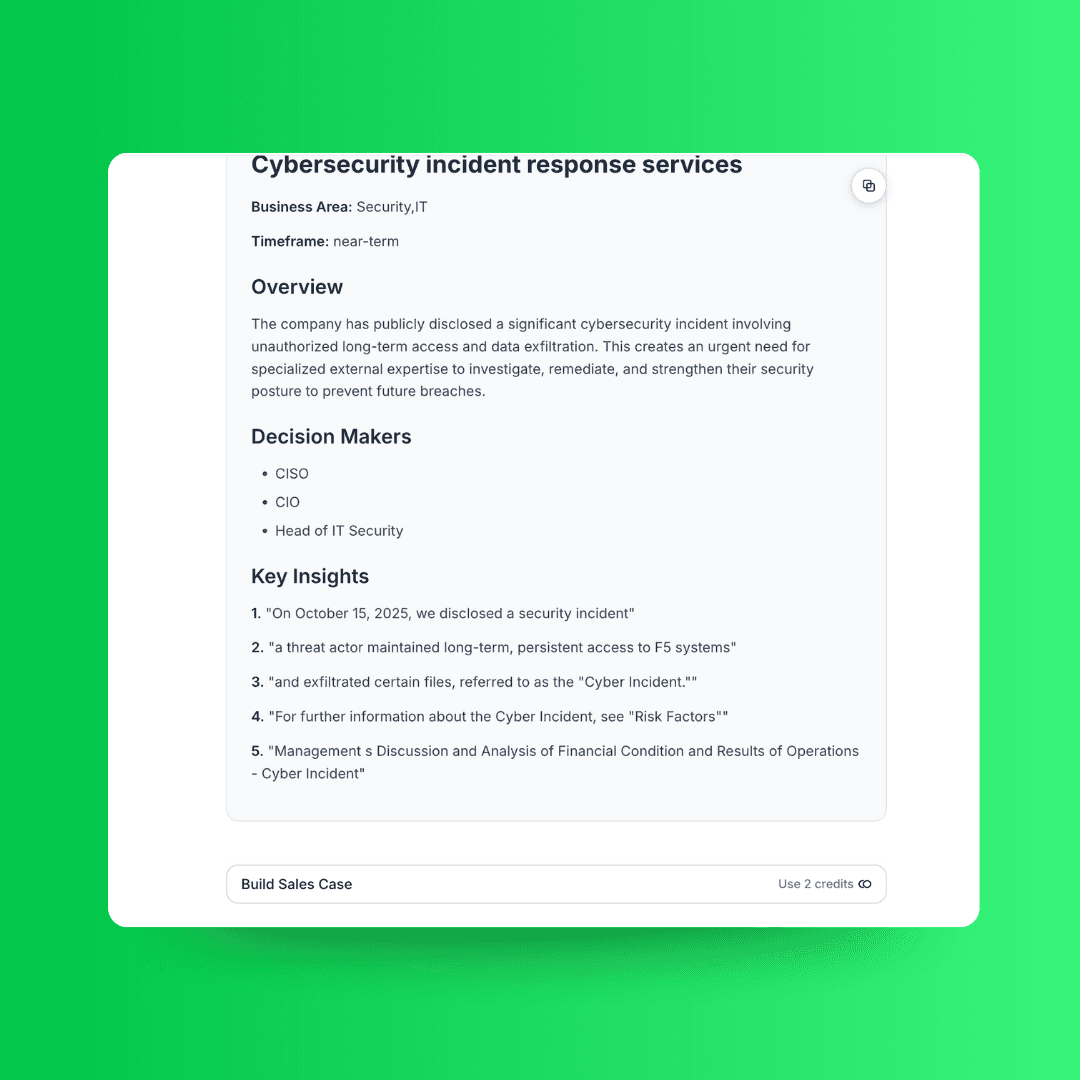 Fective.ai reads every SEC filing, surfacing the key insights and leadership quotes that help B2B enterprise teams close more deals.