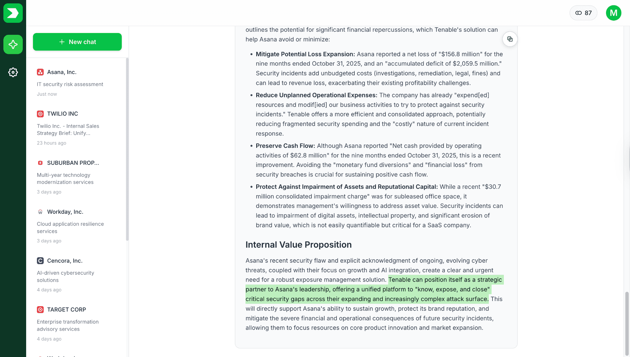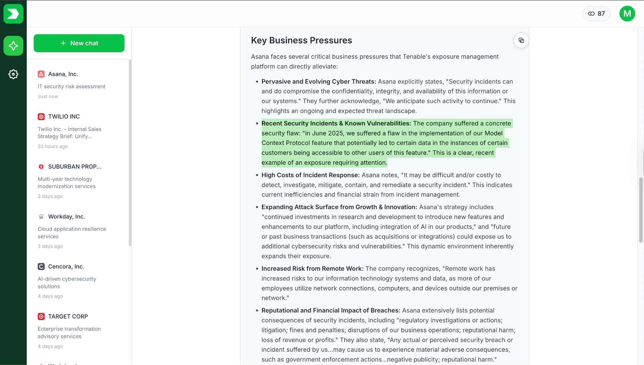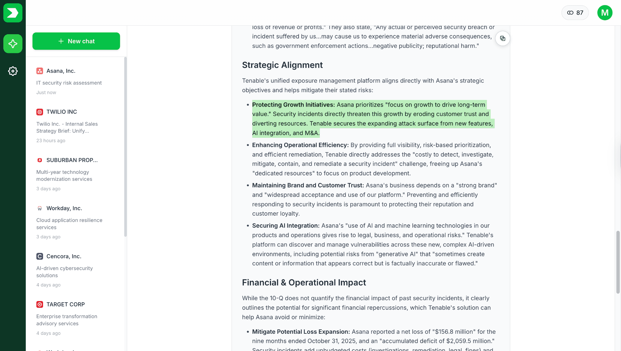 In about one minute, Fective reads Asana’s full filing (500,000–700,000 characters) and extracts everything relevant to Tenable’s offer.